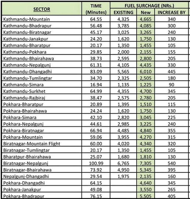 त्यसैगरी, काठमाडौं-धनगढी ४४५ रुपैयाँ, काठमाडौं-विराटनगर २४० रुपैयाँ, काठमाडौं-भद्रपुर ३०० रुपैयाँ, काठमाडौं-पोखरा १५५रुपैयाँ, काठमाडौं-नेपालगञ्ज ३३० रुपैयाँ, माउन्टेन फ्लाइटमा ३४० रुपैयाँ फ्युल सरचार्ज बढेको छ ।
