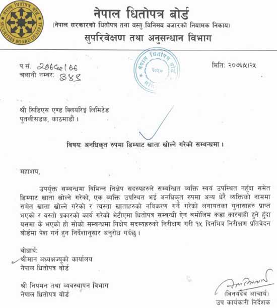 यस सम्बन्धमा निक्षेप सदस्यहरुको निरीक्षण गरी १५ दिनभित्र निरीक्षण प्रतिवेदन पेश गर्न धितोपत्र बोर्डले सीडीएससीलाई निर्देशन दिएको हो ।