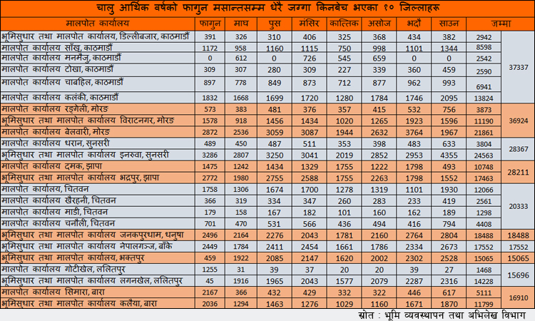 बाँकेको नेपालगञ्ज मालपोत कार्यालयबाट १७ हजार ५५२,बाराको कलैया र सीमराबाट १४ हजार ४२१, ललितपुरको गोटिखेल र लगनखेलबाट १६ हजार ६०८, र भक्तपुरमा १६ हजार ६४२ घरजग्गा किनबेच भएका छन् ।