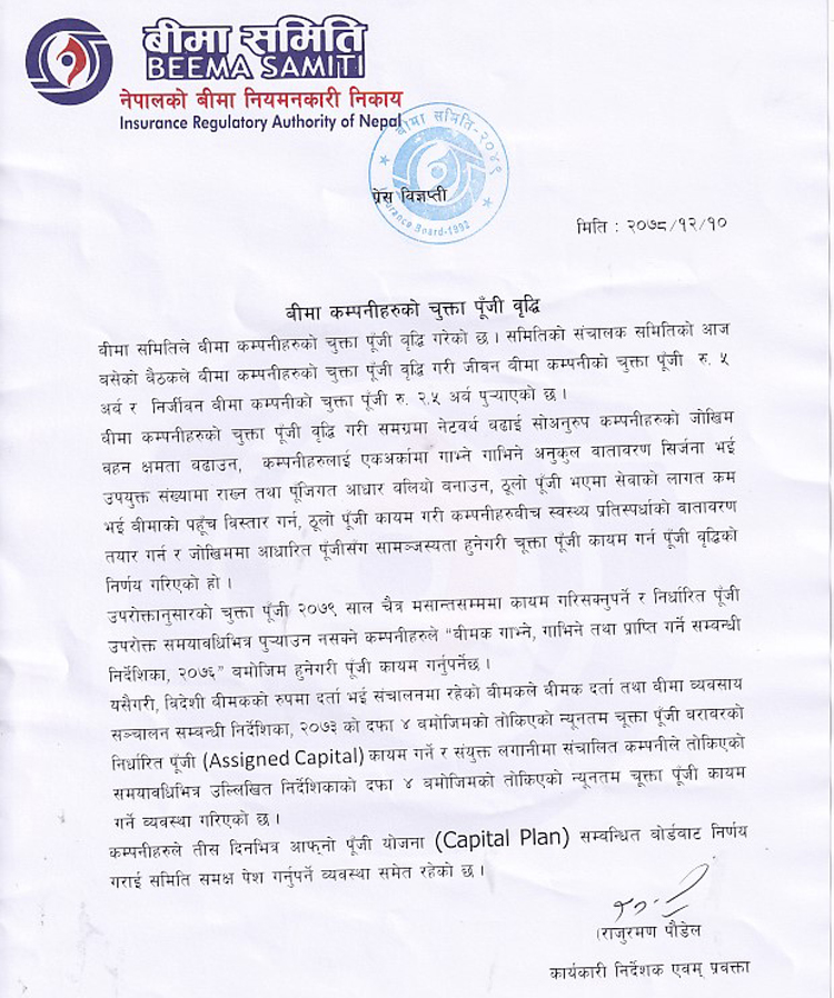 अब बीमा कम्पनीहरुले २०७९ साल चैत्र मसान्तसम्ममा तोकिएको चुक्ता पूँजी कायम गरिसक्नुपर्ने र निर्धारित पूंजी उपरोक्त समयावधिभित्र पुन्याउन नसक्ने कम्पनीहरुले बीमक गाने गाभिने तथा प्राप्ति गर्ने सम्बन्धी निर्देशिका, २०७६ बमोजिम हुनेगरी पूँजी कायम गर्नुपर्नेछ ।