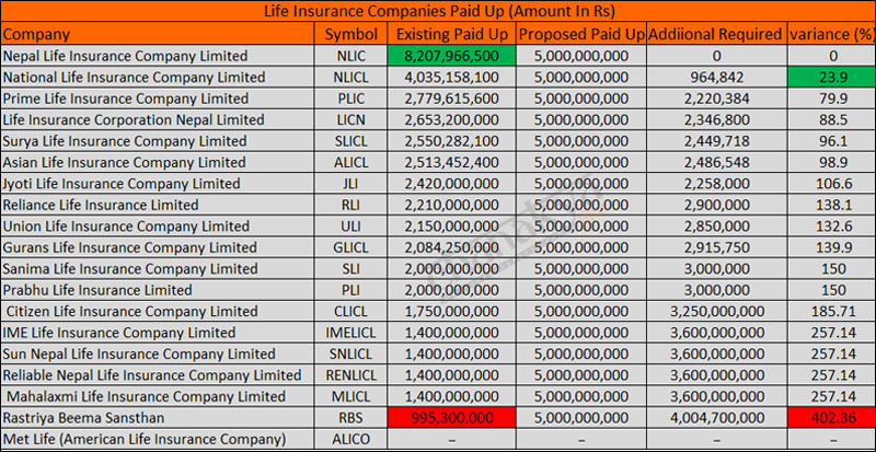 नेपाल लाइफ बाहेक बाँकी १८ वटै जीवन बीमा कम्पनीहरूले चुक्ता पूँजी वृद्धि गर्नुपर्ने छ । नेप्सेमा सूचीकृत १२ जीवन कम्पनी (नेपाल लाइफसहित)हरूको चुक्ता पूँजी २ अर्ब बढी रहेको छ भने सूचीकृत नयभएका अरु ७ कम्पनीको २ अर्ब बढी छ ।