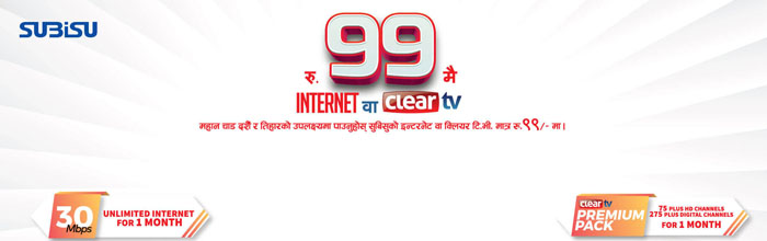 ३० एमबीपीएस गतिको इन्टरनेट सेवा ९९ रुपैयाँमै पाइने कम्पनीले जानकारी दिएको छ। त्यस्तै यही अफरमा ग्राहकले क्लियर टिभि प्रिमियम प्याकेज पनि ९९ रुपैयाँमै पाउने छन्। यो टिभी प्याकेजमा ७५ भन्दा बढी एचडी च्यनलसहित २७५ डिजिटल च्यानल हुने छन्।