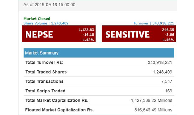 सेयर लगानीकर्ताले भदौ महिनामा मात्र १ खर्ब १५ अर्ब रुपैयाँ गुमाएका छन् । भदौ १ गते कूल बजार पूँजीकरण १५ खर्ब ४२ अर्ब ४ करोड रहेकोमा आजसम्म आइपुग्दा १४ खर्ब २७ अर्ब ३३ करोड रुपैयाँमा संकुचित भएको छ ।
