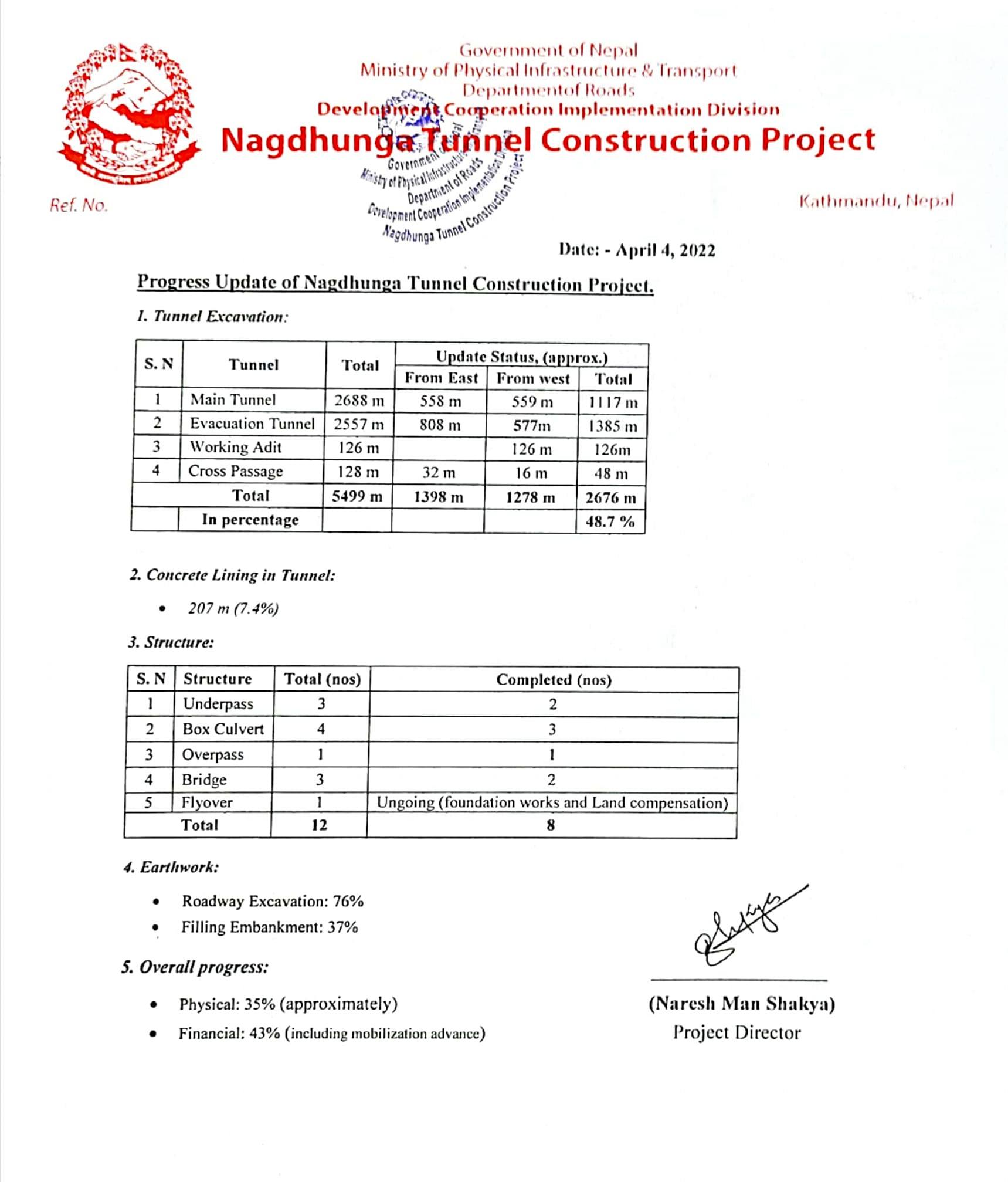 उक्त समय अनुसार नागढुंगा सुरुङमार्गको कुल निर्माण सम्पन्न हुन अब १५ महिना बाँकी रहेको नागढुंगा सुरुङमार्ग निर्माण आयोजना म्यानेजर नरेशमान शाक्यले बताए ।