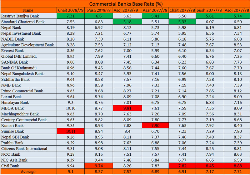 यस्तै, मेगा बैंकको १०.१, सिभिल बैंक ९.९४, कुमारी ९.८५, सिटिजन्स ९.८१, प्राइम कमर्सियल ९.६८, लक्ष्मी र सेन्चुरी कमर्सियल ९.६३, सिद्धार्थ ९.५३, हिमालयन ९.५, एनआइसी ९.३९, प्रभु ९.२९, एनसीसी ९.२८, नेपाल एसबीआई ९.२६, नेपाल बंगलादेश ९.१ र सानिमा बैंकको ९ प्रतिशत बेसरेट रहेको छ ।