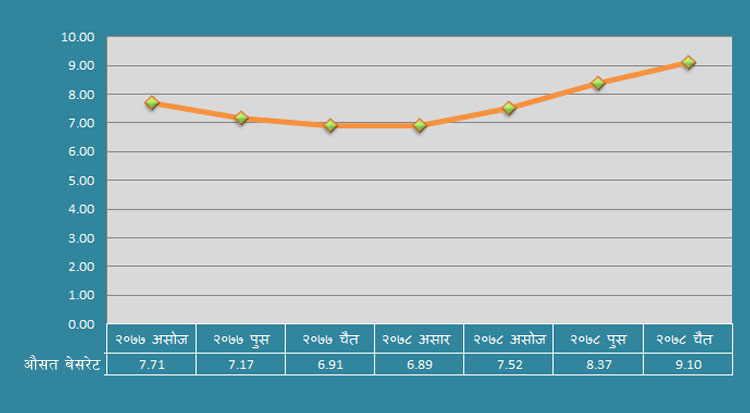 २०७७ असारमा औसतमा ८.५० पुगेको बेसरेट कोरोना महामारीले आर्थिक क्षेत्र संकूचन हुँदा अधिक तरलता कायम भएपछि २०७८ असारमा घटेर ६.८९ प्रतिशत पुगेको थियो । त्यसयता लगातार उकालो लागेको ब्याजदर असोजमा ७.५२ र पुसमा ८.३७ हुँदै चैत मसान्तमा १० प्रतिशतको हाराहारीमा पुगेको छ ।