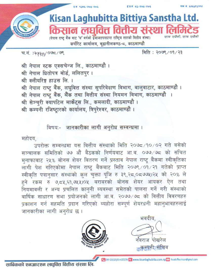 लघुवित्त संचालक समितिको २०७८ माघ २ गते बसेको बैठकले गत आवको मुनाफाबाट सेयरधनीलाई २५ प्रतिशत बोनस सेयर दिने घोषणा गरेको थियो ।