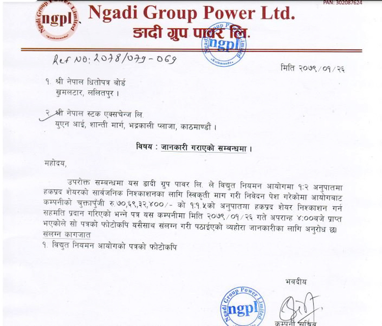काठमाडौं । ङादी ग्रुप पावर कम्पनीले हाल कायम चुक्ता पूँजीको १५० प्रतिशत हकप्रद सेयर जारी गर्न अनुमति पाएको छ ।