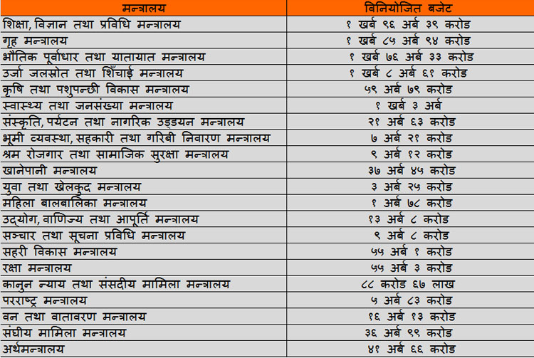 मन्त्रालयगत रुपमा हेर्दा सरकारले सबैभन्दा धेरै शिक्षा, विज्ञान तथा प्रविधि मन्त्रालयलाई सरकारले सबैभन्दा धेरै बजेट दिएको छ भने खेलकुदलाई सबैभन्दा कम छुट्याइएको छ ।