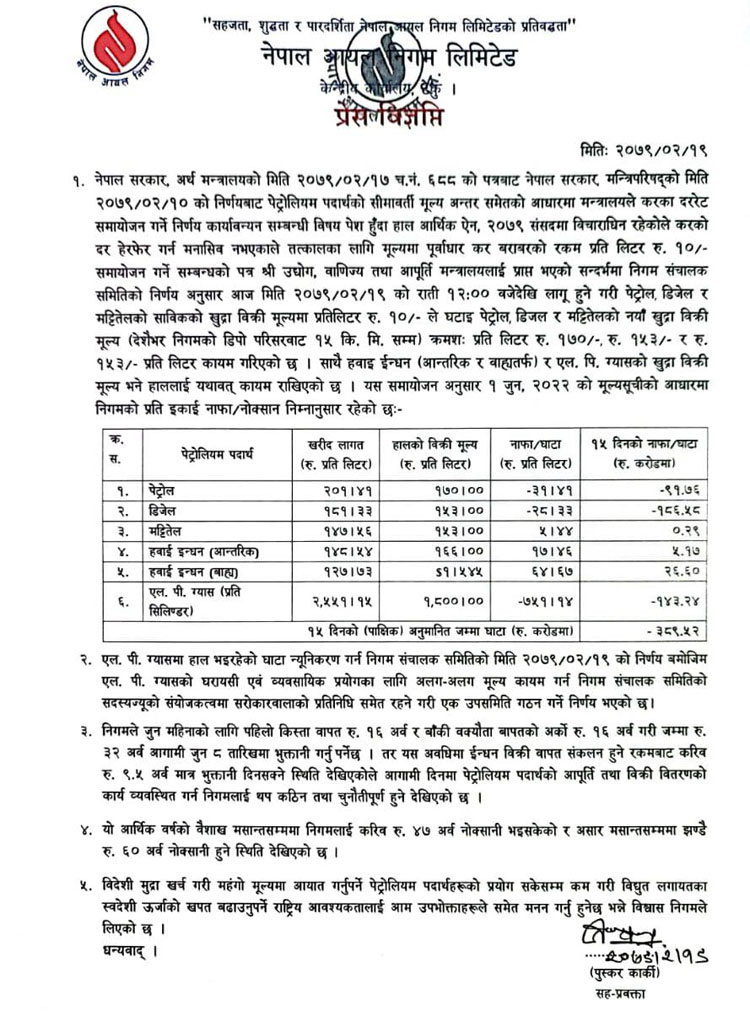 खाना पकाउने एलपी ग्यास र हवाई इन्धन (आन्तरिक र अन्तर्राष्ट्रिय)को मूल्य भने यथावत राखिएको निगमले जनाएको छ ।