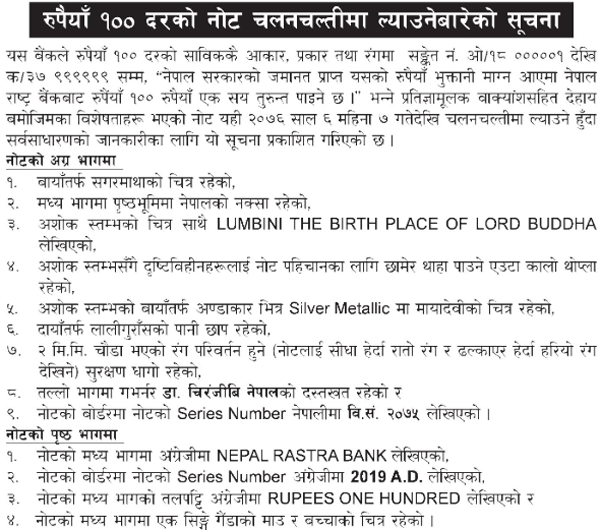 राष्ट्र बैंकले सङ्केत नं. ओ/१८०००००१ देखि क/३७ ९९९९९९ सम्मका नोट प्रचलनमा ल्याएको हो।३ अर्ब बराबरका नयाँ नोट आजदेखि बजारमा पठाइएको राष्ट्र बैंकले जनाएको छ ।