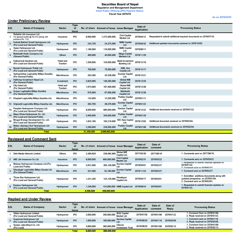 बोर्डका अनुसार सिक्लेस हाइड्रोपावर लिमिटेडले २० करोड रुपैयाँ बराबरको २ लाख कित्ता सेयर, सुपरमाई हाइड्रोपावरले १० करोडको १० लाख कित्ता र सान्जेन जलविद्युत् कम्पनी लिमिटेडले ३६ करोड ५० लाख रुपैयाँ बराबरको ३६ लाख ५० हजार कित्ता आइपीओ निष्काशनका लागि बोर्ड अनुमति दिने तयारीमा छ ।