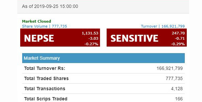 आज सेयर बजार मापक सूचक नेप्से ३.०३ अंकले घटेर ११३१.५३ अंकमा आइपुगेको छ । आज १६६ कम्पनीको १६ करोड ६९ लाख २१ हजार ७९९ रुपैयाँको कारोबार भएको छ । ७ लाख ७७ हजार ७३५ कित्ता सेयर खरिदबिक्री भएका छन् ।