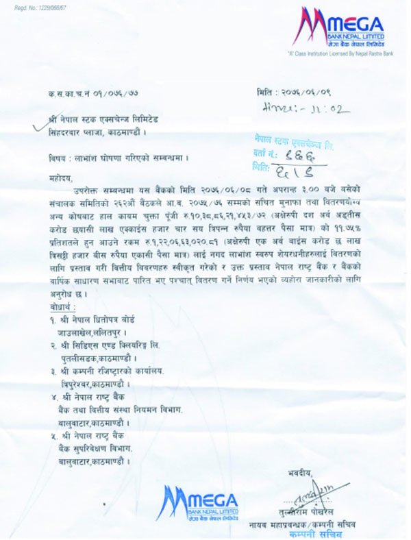 बैंकले प्रस्ताव गरेको उक्त लाभांश नियामक निकाय नेपाल राष्ट्र बैंकको स्वीकृति तथा बैंकको आगामी वार्षिक साधारण सभाले अनुमोदन गरेपश्चात मात्र सेयरधनीले पाउनेछन्।
