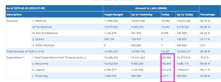 महालेखा नियन्त्रकका अनुसार शनिबार चालु खर्च अन्तर्गत १० अर्ब ५८ करोड र पूँजीगत खर्च अन्तर्गत १४ अर्ब ७२ करोड रुपैयाँ भुक्तानी भएको छ ।