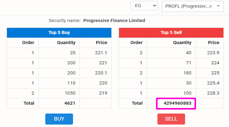 सोमबार (१२ः५० बजेसम्म)नेप्सेको टीएमएसमा प्रोग्रेसिभ फानान्सको नेप्सेमा सूचीकृत भएको सेयर संख्याभन्दा १० गुणा बढी सेयर विक्रीमा देखाएको हो ।