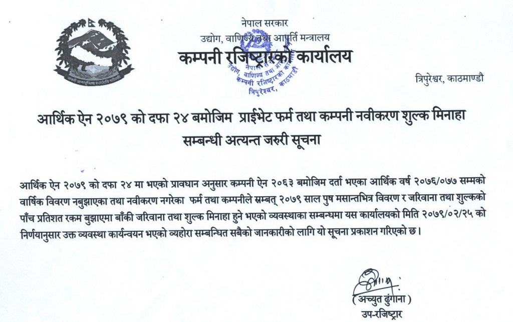 कम्पनी रजिष्ट्रार कार्यालयले एक सूचना जारी गर्दै आर्थिक वर्ष २०७६/७७ सम्मको वार्षिक विवरण नबुझाएका प्राइभेट कम्पनीहरुले २०७९ पुस मसान्तसम्म जरिवाना तथा शुल्कको ५ प्रतिशत रकम मात्रै तिरेर विवरण बुझाई नवीकरण गर्न पाउने व्यवस्था गरेको हो ।