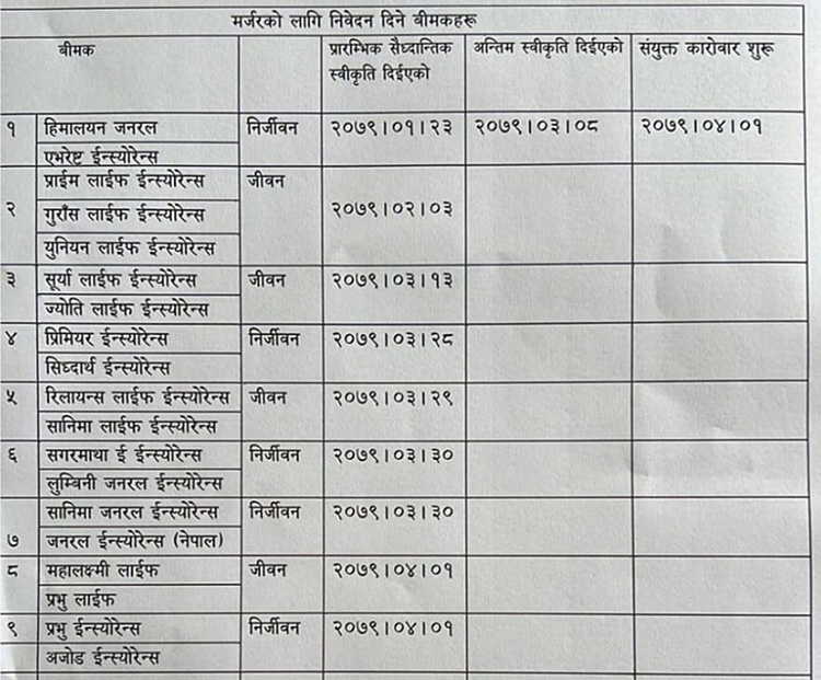 जीवन बीमातर्फ सूर्य लाइफ र ज्योती लाइफ, रिलायन्स लाइफ र सानिमा लाइफ, महालक्ष्मी लाइफ र प्रभु लाइफ तथा युनियन लाइफ, प्राइम लाइफ र गुँरास लाइफ बीच एक आपसमा मर्ज हुने सम्झौता गरेका छन् । यी मध्ये नेप्सेमा सूचीकृत नभएको महालक्ष्मी बाहेक अरु ८ कम्पनीको सेयर कारोबार रोक्का भएको हो ।
