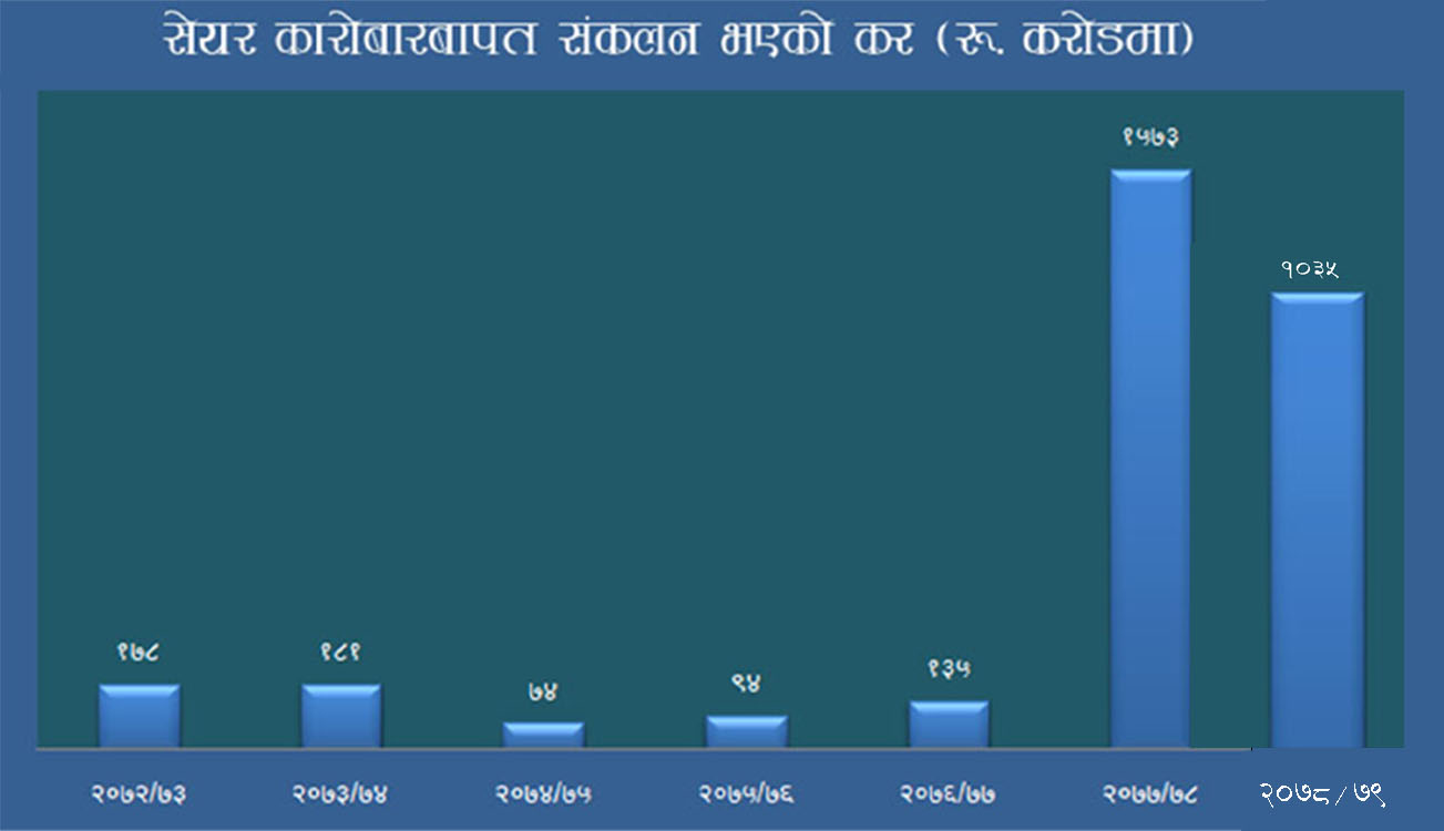 सीडीएस एण्ड क्लियरिङ लिमिटेडका अनुसार गत आर्थिक वर्ष २०७८/७९ मा सेयर कारोबारीले कमाएको नाफाबाट सरकारले १० अर्ब ३५ करोड कर उठाएको छ । यो अघिल्लो आर्थिक वर्ष २०७७/७८ को तुलनामा ५ अर्ब ३८ करोड कम हो । अघिल्लो आवमा सरकारले सेयर बजारबाट इतिहासकै धेरै १५ अर्ब ७३ करोड कर उठाएको थियो ।