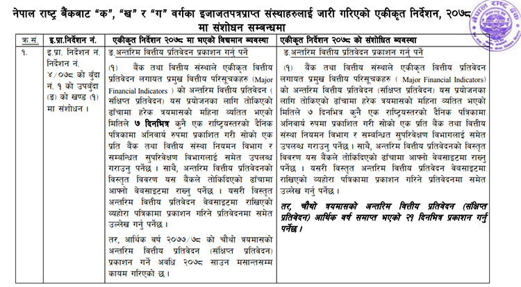 नयाँ व्यवस्था अनुसार अब बैंक तथा वित्तीय संस्थाले गत आर्थिक वर्ष २०७८/७९ को चौथो त्रैमासिक वित्तीय विवरण आर्थिक वर्ष सकिएको तेस्रो साता अर्थात् साउन २१ गतेसम्म प्रकाशित गरिसक्नुपर्ने छ ।