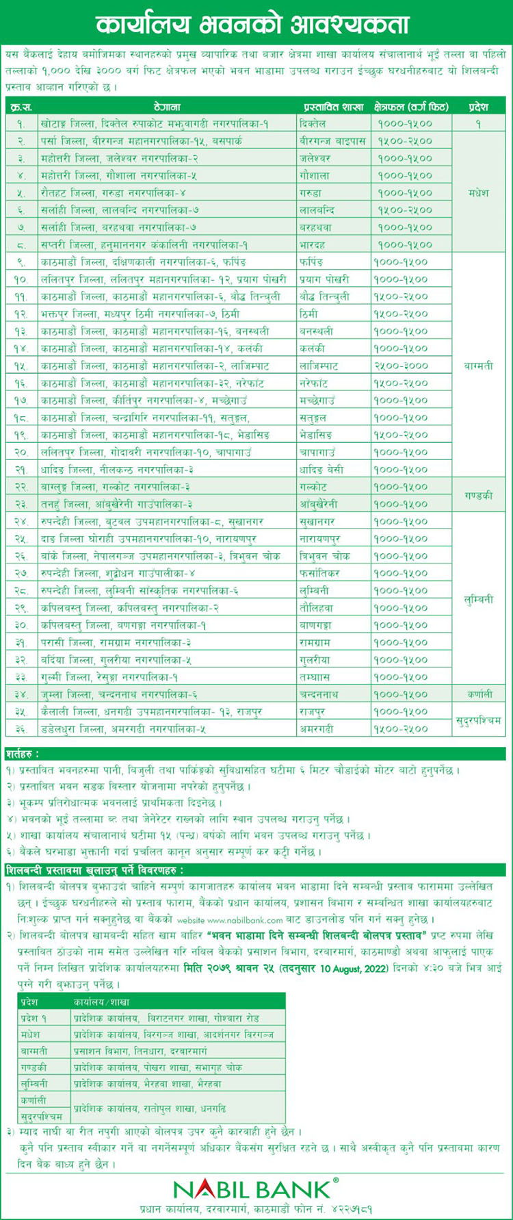 बैंकले देशका विभिन्न ३६ व्यापारिक तथा बजार क्षेत्रमा शाखा कार्यालय संचालन गर्नका लागि घर खोजी गरेको छ । बैंकले एक सूचना प्रकाशित गर्दै शाखा कार्यालय राख्नका लागि १ हजारदेखि ३ वर्गफिट क्षेत्रफलको घर भाडामा लिने भएको हो ।