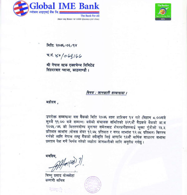 ग्लोबलले घोषणा गरेको यो लाभांश हालसम्मकै सर्वाधिक हो ।अघिल्लो वर्ष बैंकले १६ प्रतिशत बोनस सेयर वितरण गरेको थियो ।