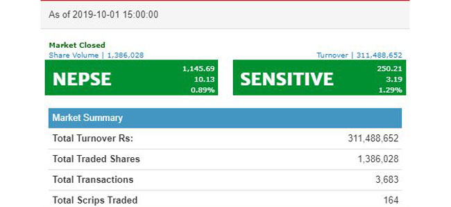 सेयर बजार मापक सूचक नेप्से १०.१३ अंकले बढेर ११४५.६९ विन्दुमा पुगेको छ । आज १६४ कम्पनीको ३१ करोड १४ लाख ८८ हजार ६५२ रुपैयाँको कारोबार भएको छ । १३ लाख ८६ हजार ०२८ कित्ता सेयर किन बेच भएका छन् ।