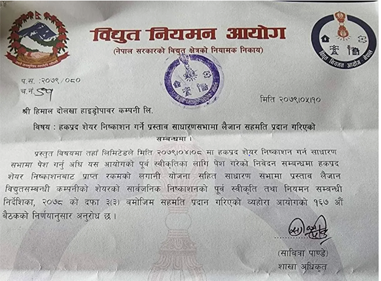 काठमाडौं । हिमाल दोलखा हाइड्रोपावर कम्पनीले हकप्रद सेयर निष्कासन गर्न स्वीकृति पाएको छ । विद्युत् नियमन आयोगले कम्पनीलाई १ः०.७५ अनुपातमा हकप्रद सेयर विक्री गर्न स्वीकृति दिएको हो ।
