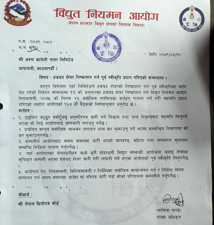 काठमाडौं । अरुण काबेली पावर कम्पनीले हकप्रद सेयर निष्कासन गर्न स्वीकृति पाएको छ । विद्युत् नियमन आयोगले कम्पनीलाई १ः१ अनुपातमा हकप्रद सेयर विक्री गर्न अनुमति दिएको हो ।