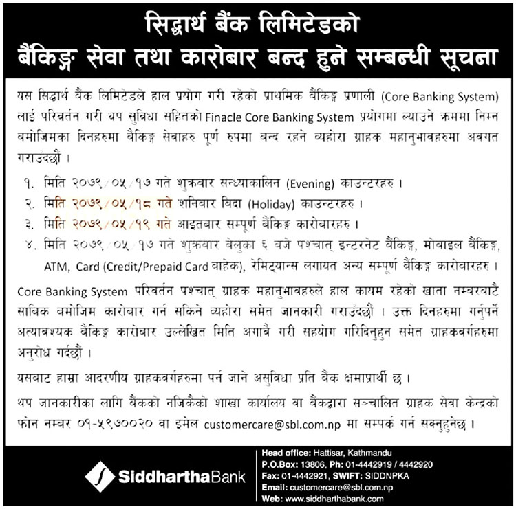 काठमाडौं । सिद्धार्थ बैंक लिमिटेडका बैंकिङ सेवा तथा कारोबार ३ दिन बन्द हुने भएको छ ।