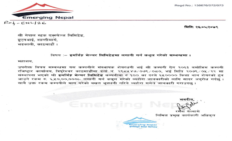 कम्पनीले इमर्जिङ भेन्चर लिमिटेडमा प्रतिकित्ता १०० रुपैयाँका दरले ६ करोड ५० लाख रुपैयाँ बराबरको ६ लाख ५० हजार कित्ता सेयर लगानी गर्ने कबुल गरेको हो ।
