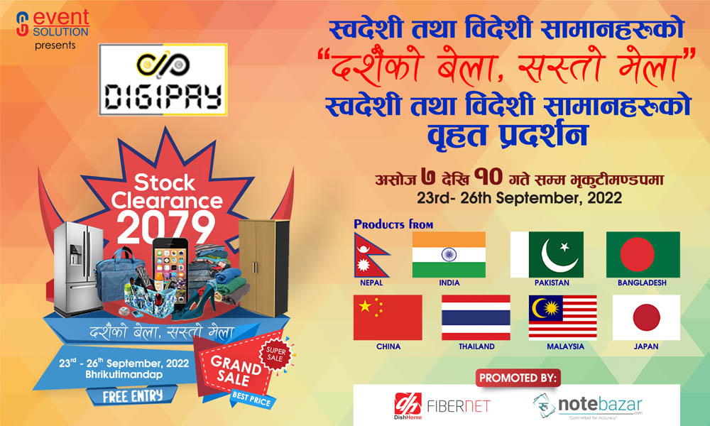 काठमाडौं । दशैंको अवसर पारेर आउँदो शुक्रबारदेखि भृकुटीण्डपमा डिजी पे स्टक क्लियरेन्स मेला ‘ग्राण्ड सेल’ आयोजना हुने भएको छ । दशैंका लागि सस्तो मूल्यमा वस्तु तथा सेवा एकै छानामुनी उपलब्ध गराउने उद्देश्यका साथ इभेण्ट सोलुसन प्रालिले मेला आयोजना गर्न लागेको हो ।