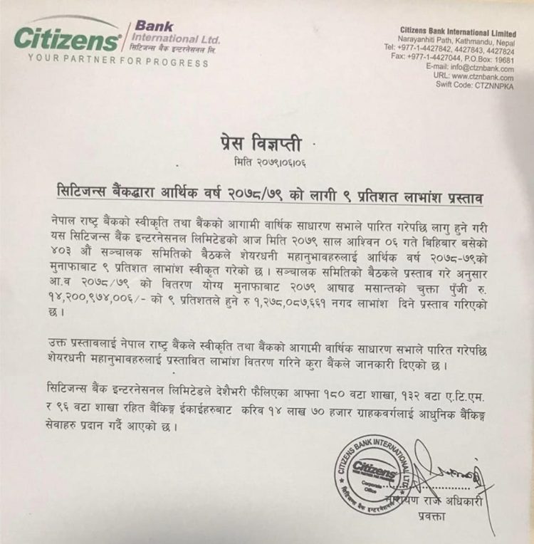 काठमाडौं । सिटिजन्स बैंक इन्टरनेशनलले गत आर्थिक वर्ष २०७८/७९ को मुनाफाबाट लाभांश घोषणा गरेको छ ।
