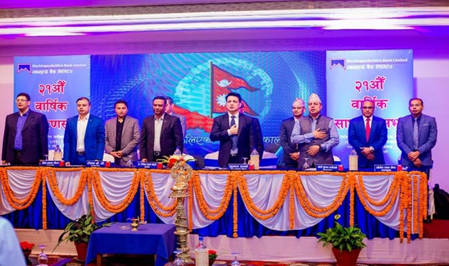 काठमाडौं । माछापुच्छ्रे बैंकको २१ औं वार्षिक साधारण सभा सम्पन्न भएको छ । होटल पोखरा ग्राण्डमा असोज २४ गते शुक्रबार सम्पन्न भएको उक्त साधारण सभाले आर्थिक वर्ष २०७५/०७६ को मुनाफाबाट सञ्चालक समितिले प्रस्ताव गरेको १६ प्रतिशत लाभांश पारित गरेको छ।