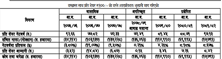 गत असार मसान्तसम्म प्रतिसेयर नेटवर्थ ७२.४९ रुपैयाँ छ भने चालु आवमा ८१.४५ रुपैयाँ पुग्ने प्रक्षेपण छ । यस्तै, गत वर्ष ०.१५ रुपैयाँ प्रतिसेयर आम्दानी रहेको कम्पनीको चालु आवमा प्रतिसेयर आम्दानी ३.४६ रुपैयाँ पुग्ने अनुमान छ ।