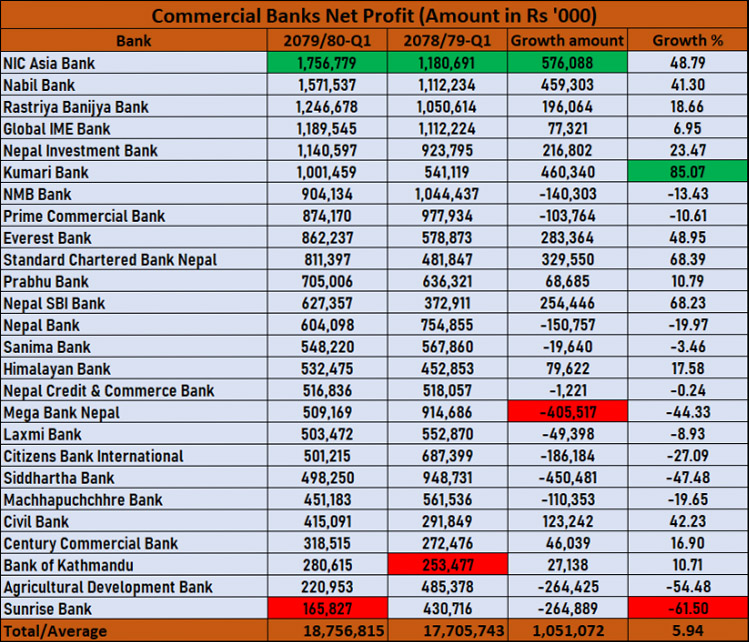 चालु आवमा एनआइसी एशिया, नबिल, ग्लोबल आइएमई, राष्ट्रिय वाणिज्य, कुमारी र नेपाल इन्भेष्टमेन्ट बैंकले १ अर्ब बढी नाफा कमाएका हुन् ।