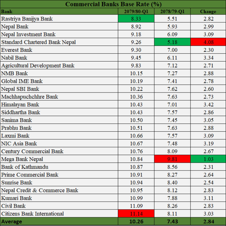 यस्तै, १७ वटा बैंकको बेसरेट १० देखि ११ प्रतिशतको बीचमा रहेको छ । १ वर्षको अवधिमा २६ वटै बैंकको बेसरेट बढेको छ । यस अवधिमा बैंकहरूको बेसरेट १ देखि ४ प्रतिशतसम्म बढेको छ ।