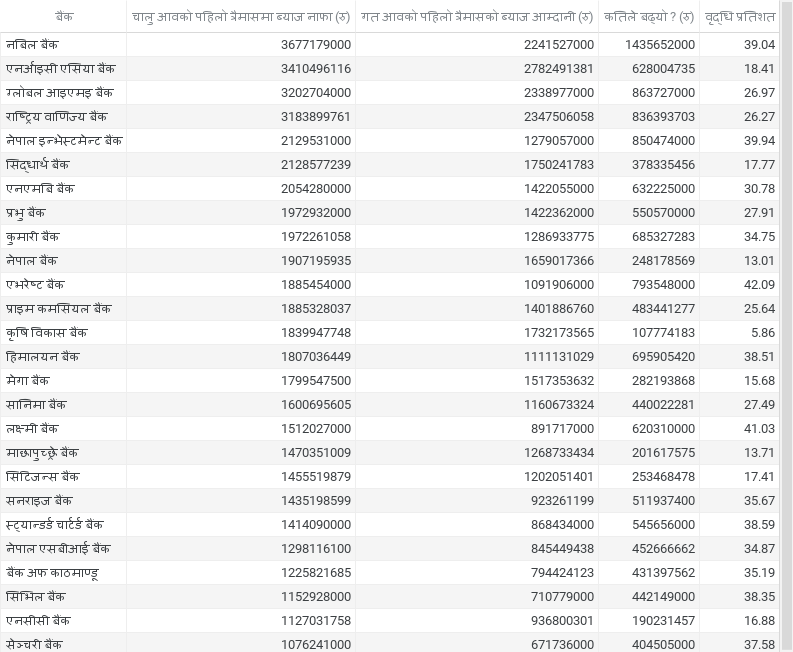 प्रभु र कुमारी बैंकले रु एक अर्ब ९७ करोड कमाएका छन् भने नेपाल बैंक लिमिटेडले रु एक अर्ब ९० करोड खुद ब्याजबाट नाफा गरेको छ । एभरेस्ट बैंक र प्राइम कमर्सियल बैंकले रु एक अर्ब ८८ करोड ब्याज नाफा आर्जन गरेका छन् । साथै, कृषि विकास बैंकले रु एक अर्ब ८३ करोड, हिमालयन बैंकले एक अर्ब ८० करोड र मेगा बैंकले एक अर्ब ७९ करोड खुद ब्याज नाफा आर्जन गर्न सफल भएका छन् ।