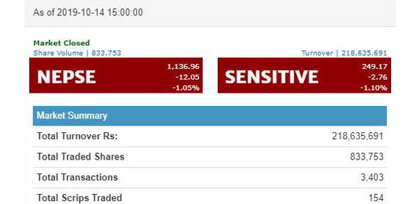सेयर बजार मापक सूचक नेप्से १२.०५ अंकले घटेर ११३६.९६ विन्दुमा पुगेको छ । आज १५४ कम्पनीको २१ करोड ८६ लाख ३५ हजार ६९१ रुपैयाँको कारोबार भएको छ । ८ लाख ३३ हजार ७५३ कित्ता सेयर किन बेच भएका छन् ।