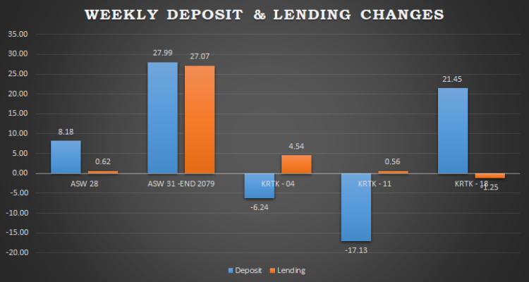 कात्तिक ११ गतेसम्म ४५ खर्ब २४ अर्ब रहेको बैंकहरुको निक्षेप १८ गते आइपुग्दा ४५ खर्ब ४५ अर्ब रुपैयाँ पुगेको छ । यो अवधिमा विदेशी मुद्राको निक्षेप पनि ३ अर्बले थपिएको छ।