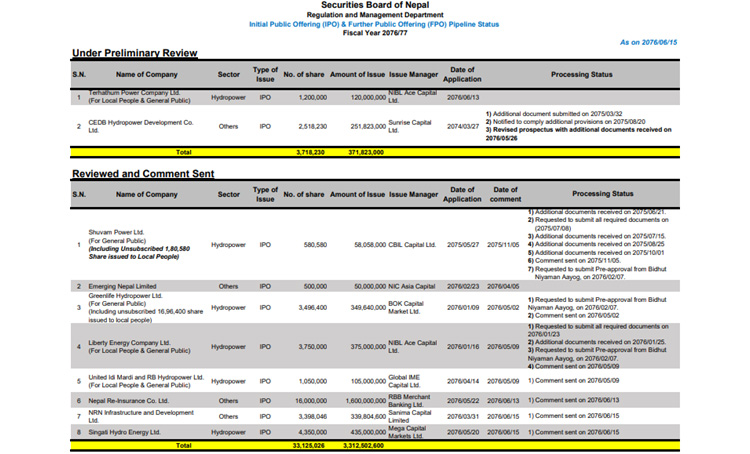 हाल धितोपत्र बोर्डमा सर्वसाधारणलाई सेयर विक्री गर्नका लागि आवेदन दिने जलविद्युत कम्पनीहरुमा तेह्रथुम पावर कम्पनी, बीइबीडी हाइड्रोपावर, ग्रीन लाइफ हाइड्रोपावर, लीबर्टी इनर्जी कम्पनी, युनाइटेड इडी मार्डी एण्ड आरबी हाइड्रोपावर, सिङगटी हाइड्रो र माइलुङ खोला जलविद्युत रहेका छन् ।