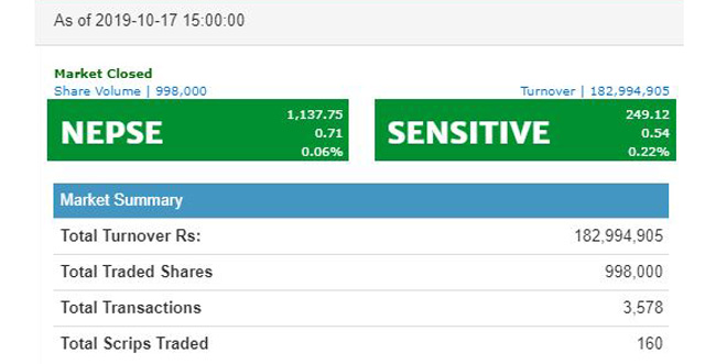 सेयर बजार मापक सूचक नेप्से ०.७१ अंकले बढेर ११३७.७५ विन्दुमा पुगेको छ । आज १६० कम्पनीको १८ करोड २९ लाख ९४ हजार ९०५ रुपैयाँको कारोबार भएको छ । ९ लाख ९८ हजार कित्ता सेयर किन बेच भएका छन् ।