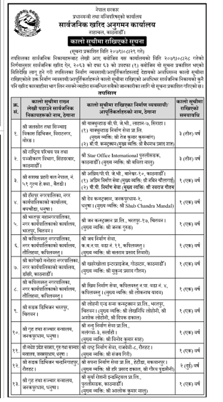 ठेक्का सम्झौता अनुसार काम नगरेको भन्दै सार्वजनिक खरिद अनुगमन कार्यालयले बिहीबार एक सूचना जारी गर्दै १३ सप्लायर्स तथा निर्माण कम्पनीलाई कालोसूचीमा राखिएको जनाएको हो ।