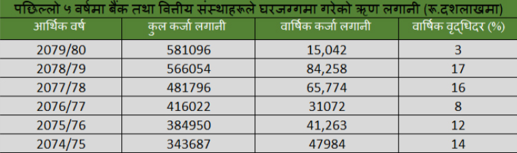५ वर्षको अवधिमा बैंकहरुले वार्षिक औसतमा ६५ अर्ब रुपैयाँ कर्जा प्रवाह गरेको राष्ट्र बैंकको तथ्यांक्ले देखाएको छ । गत वर्ष बैंकतथा वित्तीय संस्थाले घरजग्गामा ८४ अर्ब २५ करोड रुपैयाँ लगानी गरेका थिए ।