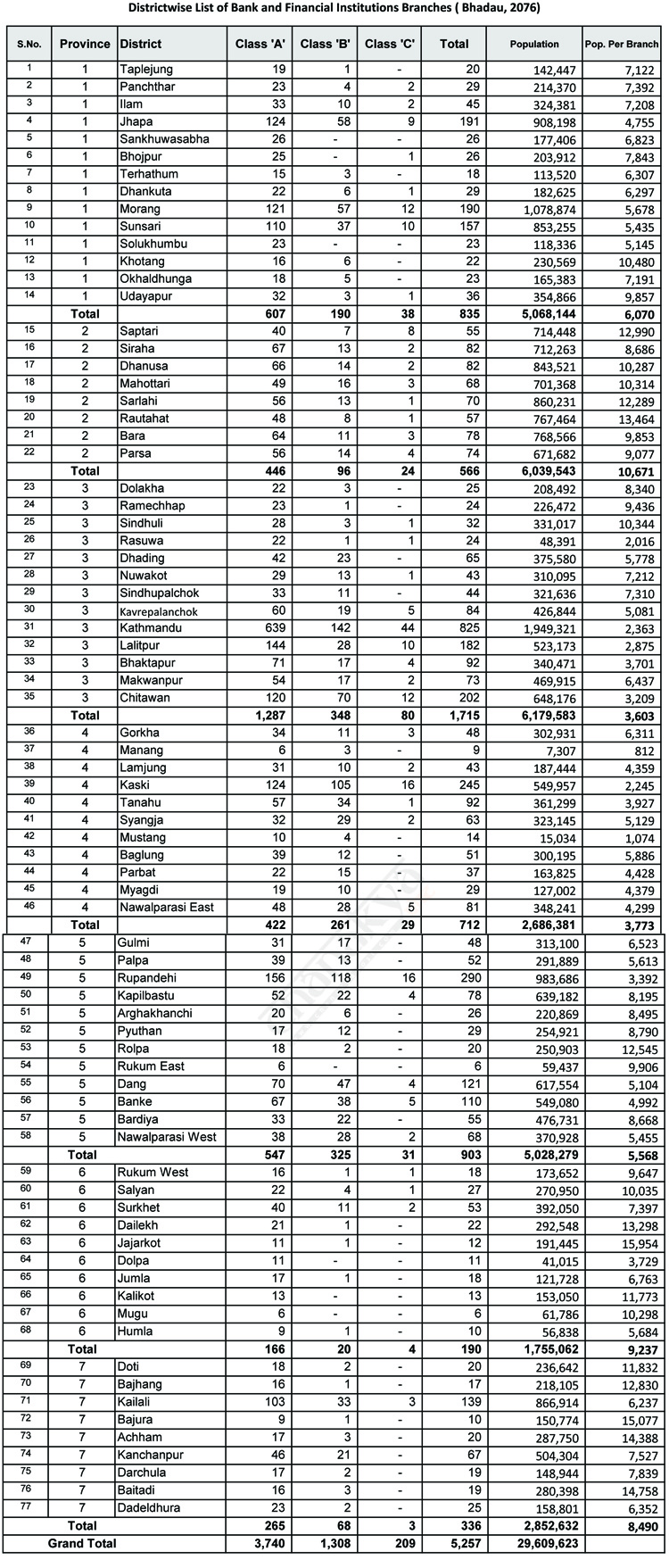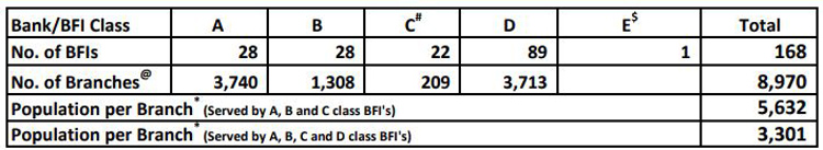 यस्तै २८ विकास बैंकका १ हजार ३०८ र २२ वटा फाइनान्स कम्पनीका २०९ वटा शाखा रहेका छन् । बैंक तथा वित्तीय संस्थाका शाखाले औसतमा ३ हजार ३०१ जनालाई बैंकिङ्ग सेवा प्रदान गरेका छन् ।