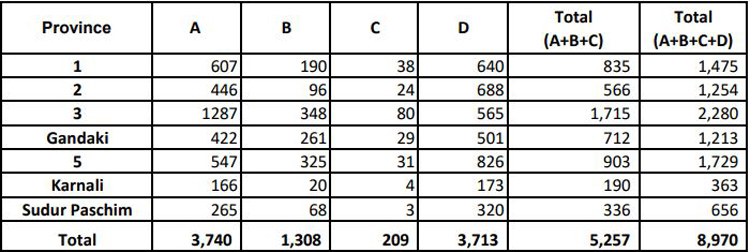 यस्तै प्रदेश १ मा १४७५, प्रदेश २ मा १२५४, गण्डकी प्रदेशमा १२१३, प्रदेश ५ मा १७२९ र सुदूरपश्चिम प्रदेशमा ६५६ वटा शाखा रहेका छन् ।