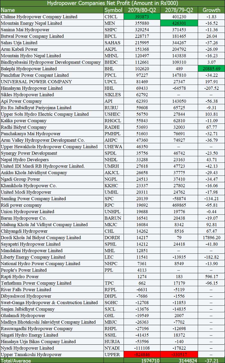 चालु आवको पुस मसान्तसम्म हाइड्रोपावर कम्पनीहरूले कुल १ अर्ब ९७ करोड खुद नाफा कमाएका छन् । गत वर्ष सोही अवधिमा यी कम्पनीहरूले कुल ३ अर्ब १४ करोड खुद नाफा कमाएका थिए । समीक्षा अवधिमा हाइड्रोपावर कम्पनीको नाफा औसतमा ३७.२१ प्रतिशतले घटेको छ ।