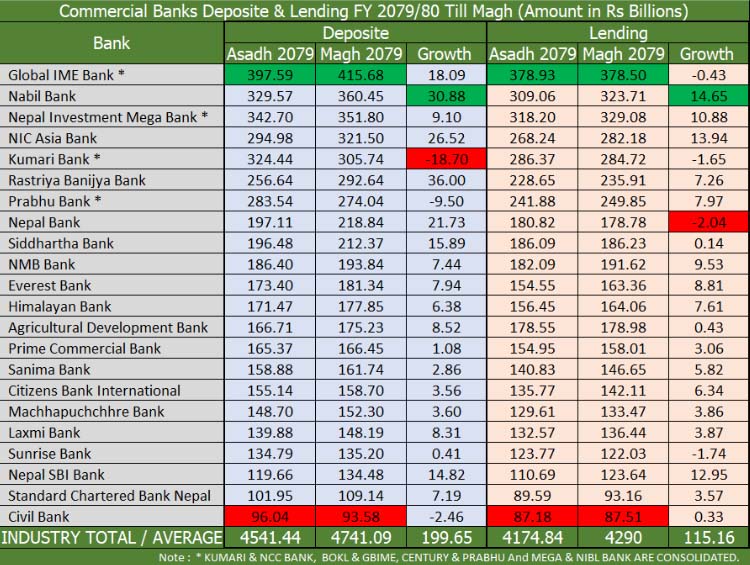 समीक्षा अवधिमा हाल संचालनमा रहेका २२ वटा वाणिज्य बैंकमध्ये ३ वटाको निक्षेप संकलन घटेको छ । यस अवधिमा कुमारी, प्रभु र सिभिल बैंकको निक्षेप संकलन असारको तुलनामा घटेको छ । त्यस्तै, यही अवधिमा ४ बैंकको कर्जा लगानी घटेको छ । असारको तुलनामा नेपाल, कुमारी, ग्लोबल आइएमई र सनराइज बैंकको कर्जा लगानी घटेको छ ।