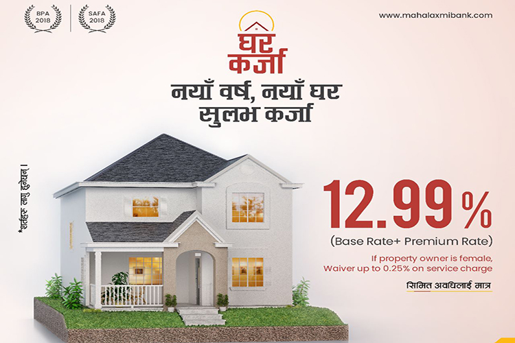 काठमाडौं। महालक्ष्मी विकास बैंकले घर किन्न १२.९९ प्रतिशत ब्याजदरमै कर्जा उपलब्ध गराउने भएको छ । बैंकले नेपाली नयाँ वर्षको अवसरमा उक्त अफर ल्याएको हो ।