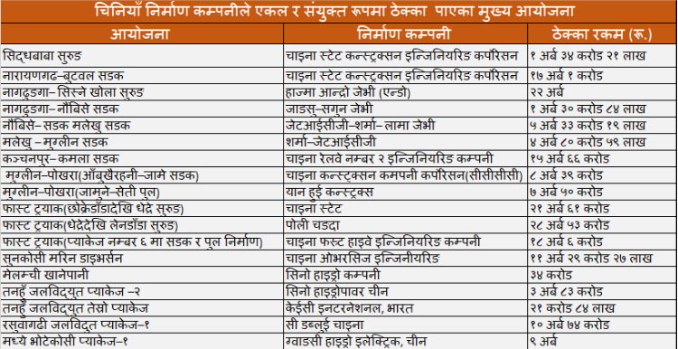 सडक, सुरुङमार्ग, प्रसारण लाइन, जलविद्युत् आयोजना लगायत डेढ दर्जन बढी ठूला र राष्ट्रिय गौरवका आयोजना चिनियाँ ठेकेदारले निर्माण गरिरहेका हुन् ।